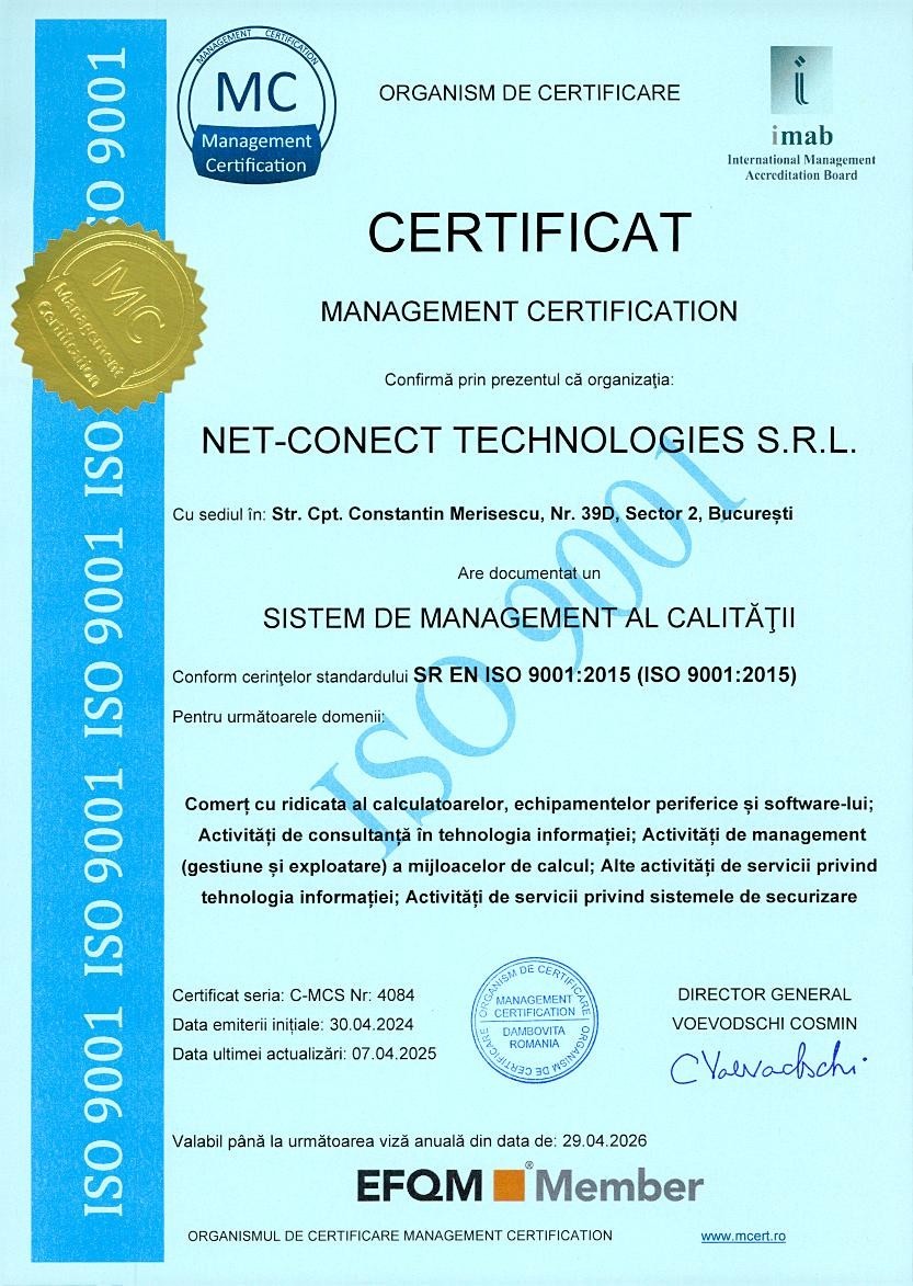 Pentru utilizarea acestui site este necesară citirea și acceptarea în totalitate a termenilor și conditților de utilizare. Dacă nu sunteți de acord cu acestea vă rugăm să nu mai utilizați acest site. SC NET-CONECT TECHNOLOGIES SRL nu poate fi trasă la raspundere în cazul în care persoanele care accesează acest site nu citesc termenii și condițiile de utilizare. Acestea vor fi considerate acceptate implicit. Textele, asezarea în pagina, ilustrațiile, fotografiile, documentațiile și alte elemente care apar pe acest site sunt protejate de catre dreptul de autor și constituie proprietatea SC NET-CONECT TECHNOLOGIES SRL Orice copie, adaptare, traducere, reprezentare sau modificare a site-ului sau a unei părti a acestuia este strict interzisă, fără acordul prealabil scris al lui SC NET-CONECT TECHNOLOGIES SRL. Denumirea si logo-ul SC NET-CONECT TECHNOLOGIES SRL fac obiectul unei protecții în calitate de marcă inregistrată și, deci, nu pot fi reproduse fără acordul prealabil scris a SC NET-CONECT TECHNOLOGIES SRL SC NET-CONECT TECHNOLOGIES SRL își rezervă dreptul să modifice în orice moment și fără preaviz conținutul site-ului. SC NET-CONECT TECHNOLOGIES SRL nu poate fi facută responsabilă pentru vreo paguba oarecare, directă sau indirectă, materială sau imaterială, pierdere de programe sau de date, care ar putea rezulta din existența, modificarea, consultarea și/sau utilizarea totală sau parțiala a site-ului sau a altor site-uri care îi sunt sau îi vor fi legate. În cazul ăn care s-ar crea legături cu alte site-uri, de către site-ul www.net-conect.ro sau datorită oricarui motor de cautare, compania SC NET-CONECT TECHNOLOGIES SRL nu poate fi considerată responsabilă pentru conținutul acestor alte site-uri. Colectarea datelor se face prin formularul de contact prin propria initiativa a utilizatorilor. Datele sunt folosite în vederea trimiterii de informații din partea SC NET-CONECT TECHNOLOGIES SRL. Informațiile personale trimise de utilizatori pe acest site sunt protejate. SC NET-CONECT TECHNOLOGIES SRL se obligă a proteja informațiile personale ale vizitatorilor site-ului. Prezenta POLITICĂ DE CONFIDENȚIALITATE se supune Dreptului Intern Roman